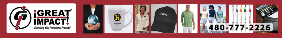 Welcome to Great Impact. You’ll find everything you need to make your promotion a success: great ideas and unique promotional products along with friendly, prompt, and personal service. We will work hard to exceed your expectations! Promotional Products - Embroidery - Screenprinting - Calendars - Awards |